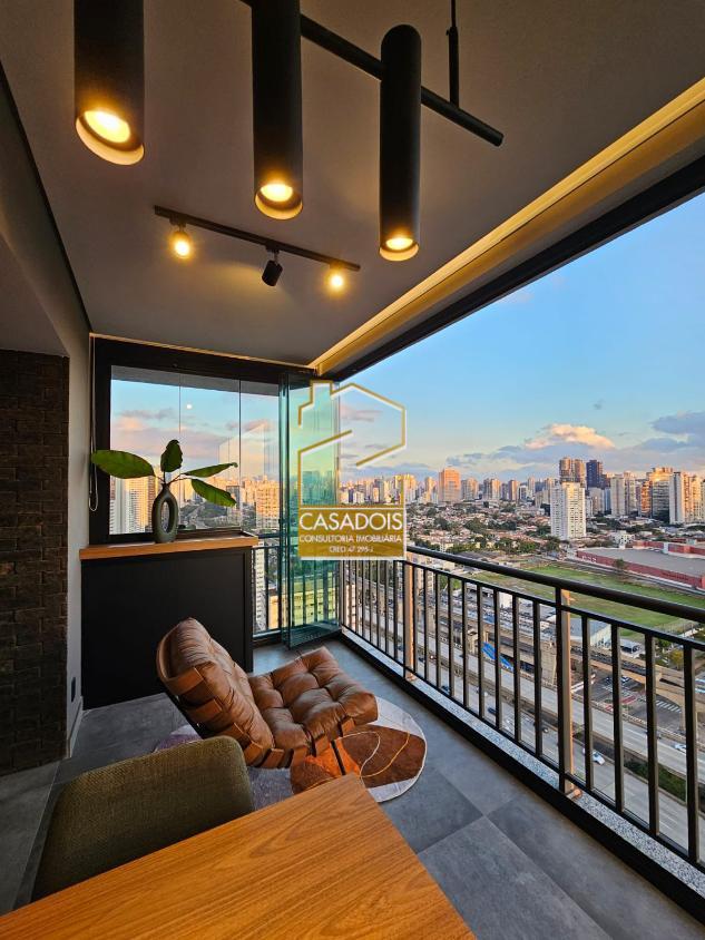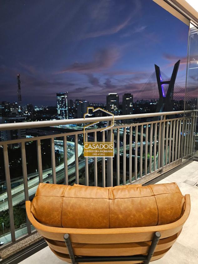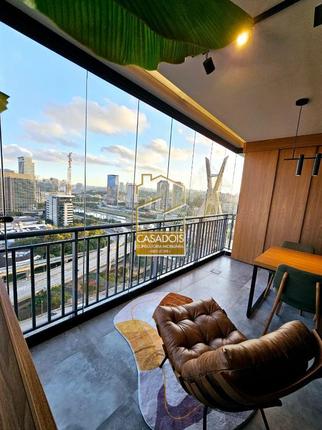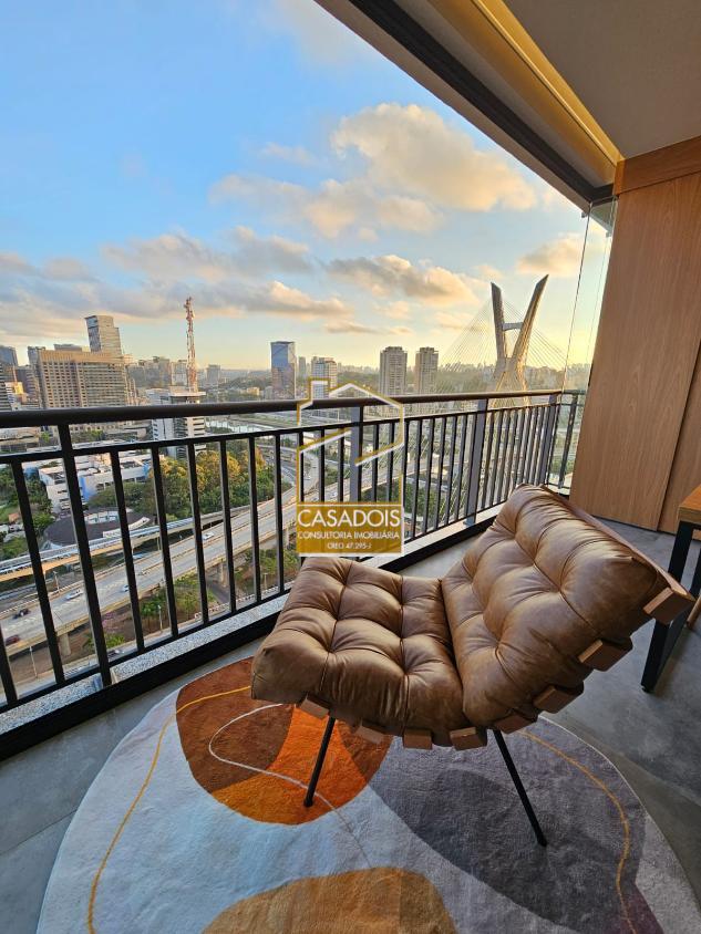Apartamento de altíssimo padrão 62m² (MOBILIADO), com pé direito de 3 metros e a melhor vista de São Paulo para a Ponte Estaiada! Imóvel deslumbrante, nunca habitado, com suíte, lavanderia, lavabo, cozinha americana integrada com sala, mesa de jantar e sacada gourmet! O apartamento inteiro conta com marcenaria de alto padrão, repleto de armários no quarto, cozinha, sala, banheiros e lavanderia! Todas as portas e gavetas contam com freio anti impacto que fecham sozinhas! Suíte possui cama-baú queen size com colchão premium Simmons, TV 65 polegadas, persiana blackout, ar-condicionado, ducha de alta pressão Deca e revestimento de pedras naturais! A Sala conta com sofá para 4 pessoas de alta densidade feito sob medida, TV 65 polegadas, persiana de tela solar para iluminação ambiente e ar-condicionado! Cozinha totalmente equipada, com geladeira Brastemp inverter, cuba dupla e torneira gourmet! É atendida por uma ilha de pedra que conta com depuradora no teto, forno Brastemp e micro-ondas! Uma mesa de marcenaria e metal com 6 cadeiras integram perfeitamente o ambiente, proporcionando refeições com uma vista única para a Ponte Estaiada! Lavanderia com máquina lava e seca de 12 KG, com tanque e armários integrados! Essa área conta com uma cobertura móvel de portas que esconde a área de serviço e integra ela perfeitamente ao ambiente sofisticado do apartamento! Sacada o local mais privilegiado do apartamento, conta com uma poltrona de couro legítimo para apreciar o cartão postal de São Paulo, além de uma mesa de apoio! Toda a sacada é revestida com fechamento de vidro reforçado de 13 MM, que proporciona isolamento acústico ao ambiente, além de tela solar para maior comodidade e iluminação ambiente! Banheiro social completo e finamente decorado. 1 vaga de garagem solta! O prédio conta com portaria 24 horas, reconhecimento facial para entrada e câmeras de segurança! Possui área de lazer com piscina, sauna e academia completa, além de coworkings e salas privativas para conferências! Na esquina da Berrini, rodeado de bares, restaurantes e imóveis comerciais!