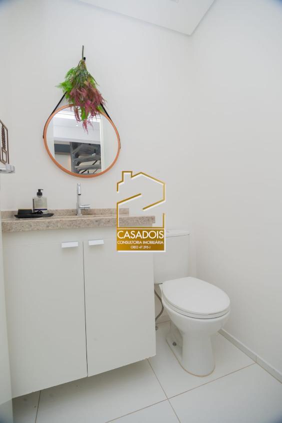 No piso inferior, o imóvel oferece uma sala ampla, bem iluminada e arejada, integrada a uma cozinha moderna e funcional, perfeita para receber amigos e familiares. Um lavabo elegante complementa o ambiente, trazendo ainda mais praticidade ao dia a dia.