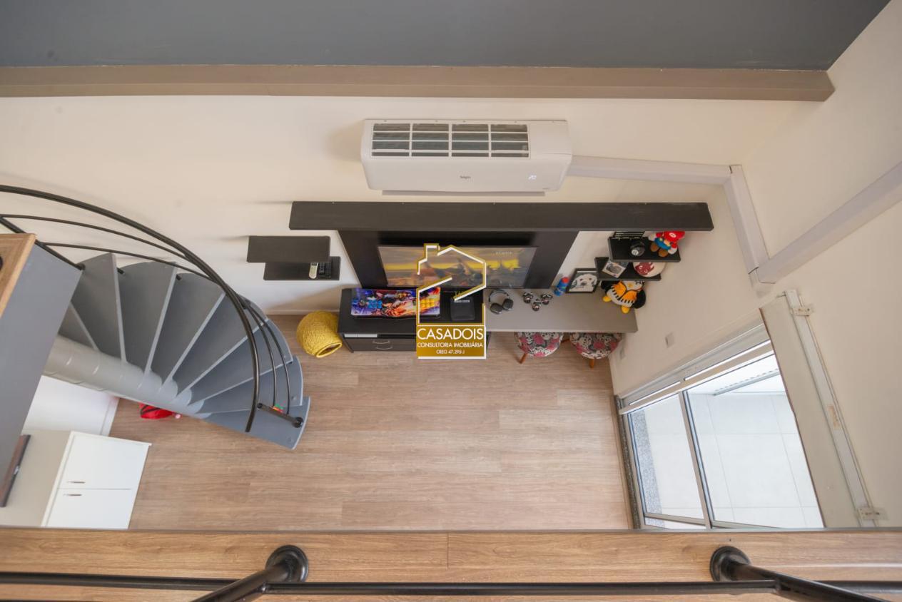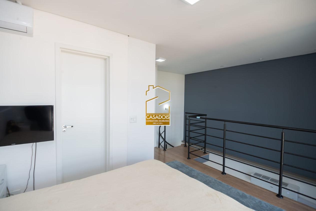 No piso superior, encontra-se um dormitório aconchegante, com espaço para armários planejados, além de um banheiro privativo com acabamentos de bom gosto. A iluminação natural abundante em todos os ambientes cria uma atmosfera acolhedora, moderna e sofisticada.