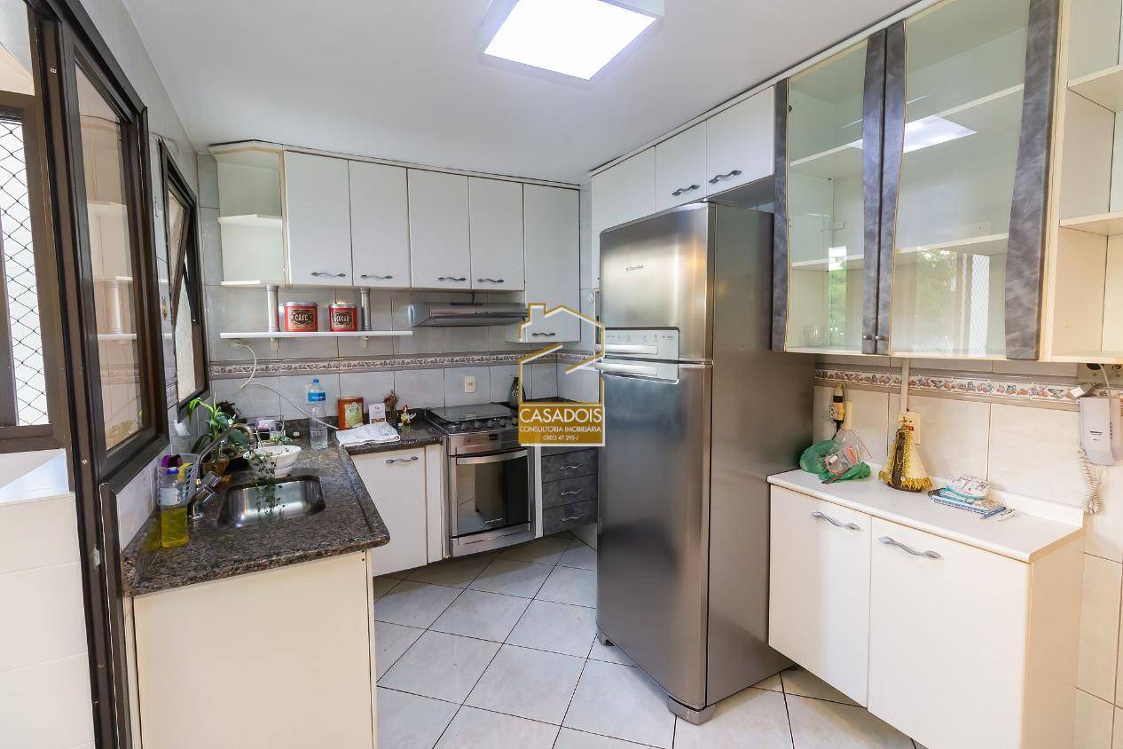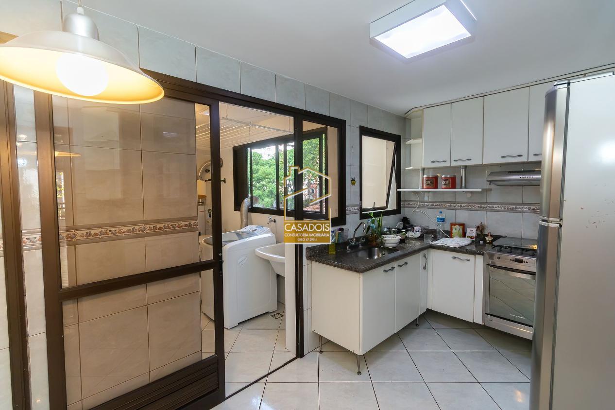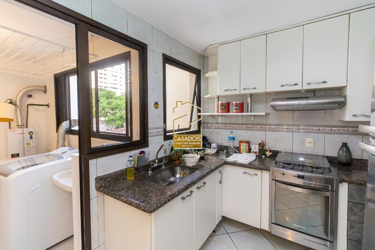 A cozinha é bem iluminada, planejada e funcional, equipada com armários sob medida que otimizam cada espaço. A área de serviço é completa e inclui dependência para funcionários.