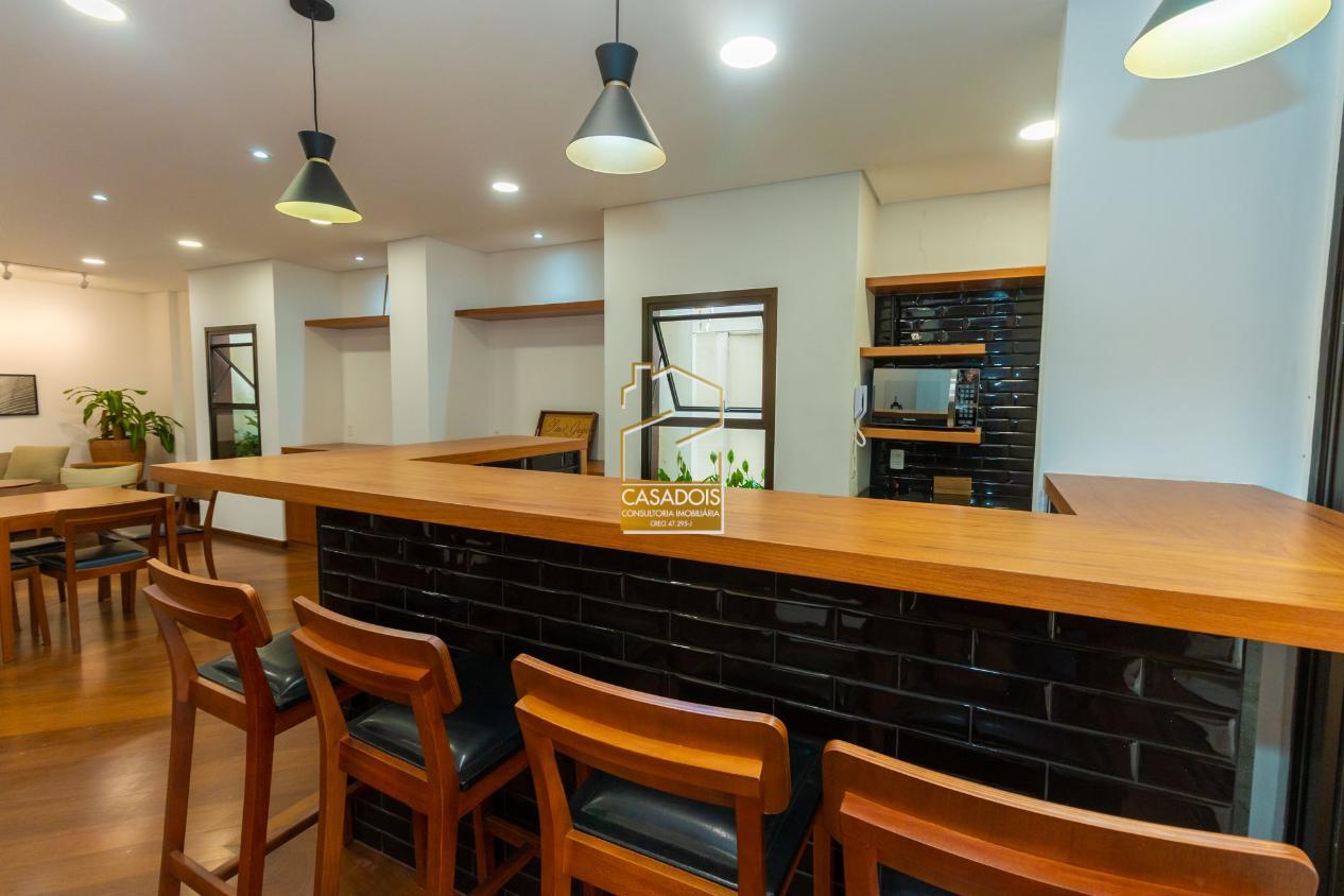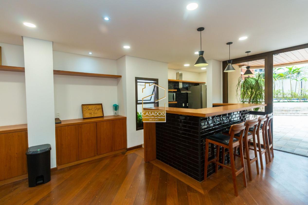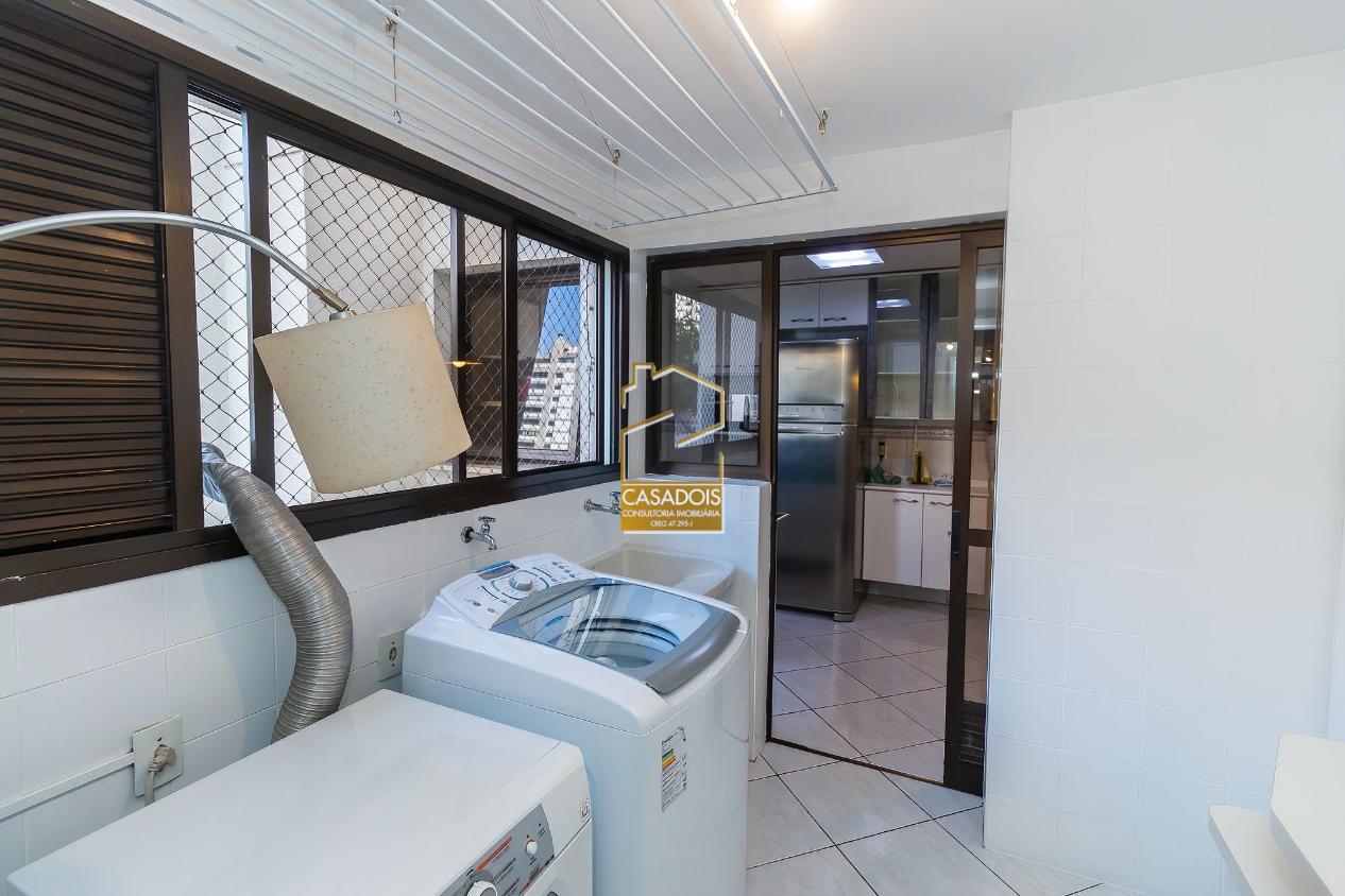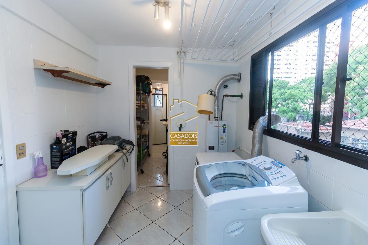 A cozinha é bem iluminada, planejada e funcional, equipada com armários sob medida que otimizam cada espaço. A área de serviço é completa e inclui dependência para funcionários.