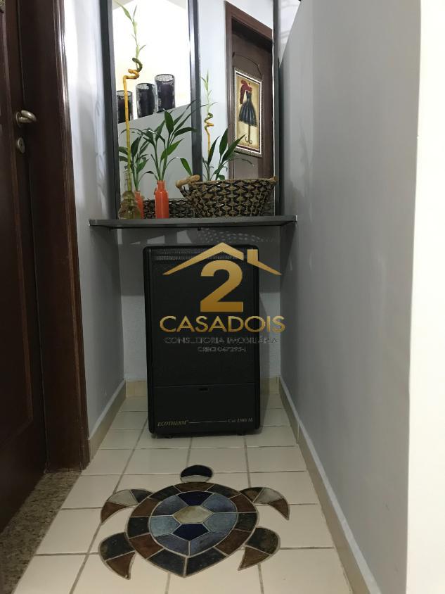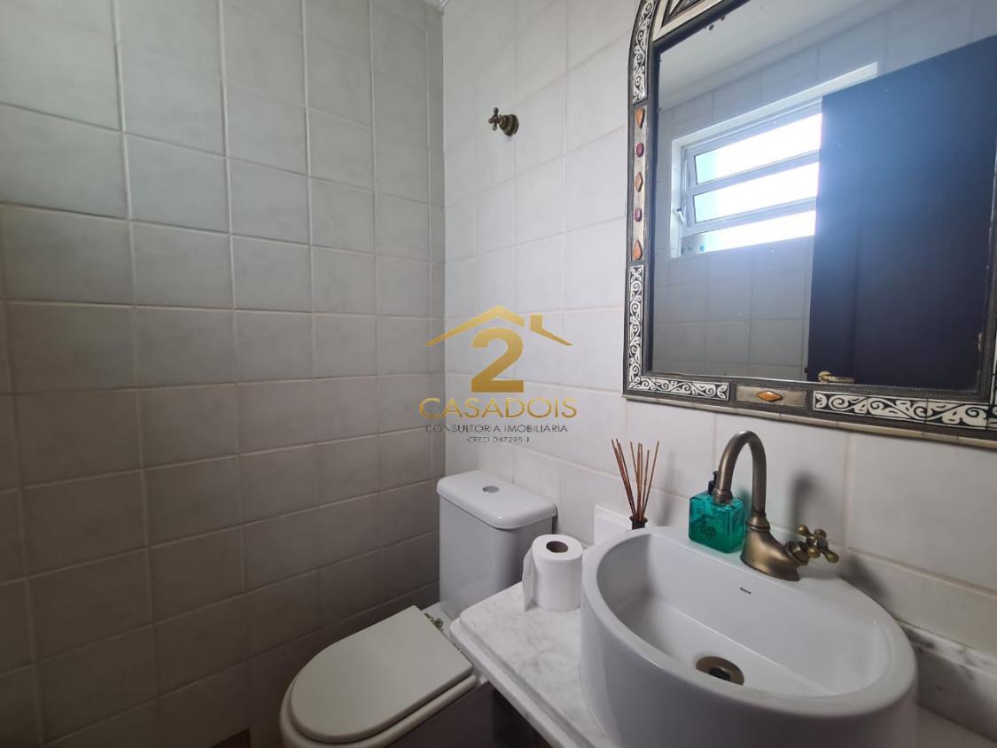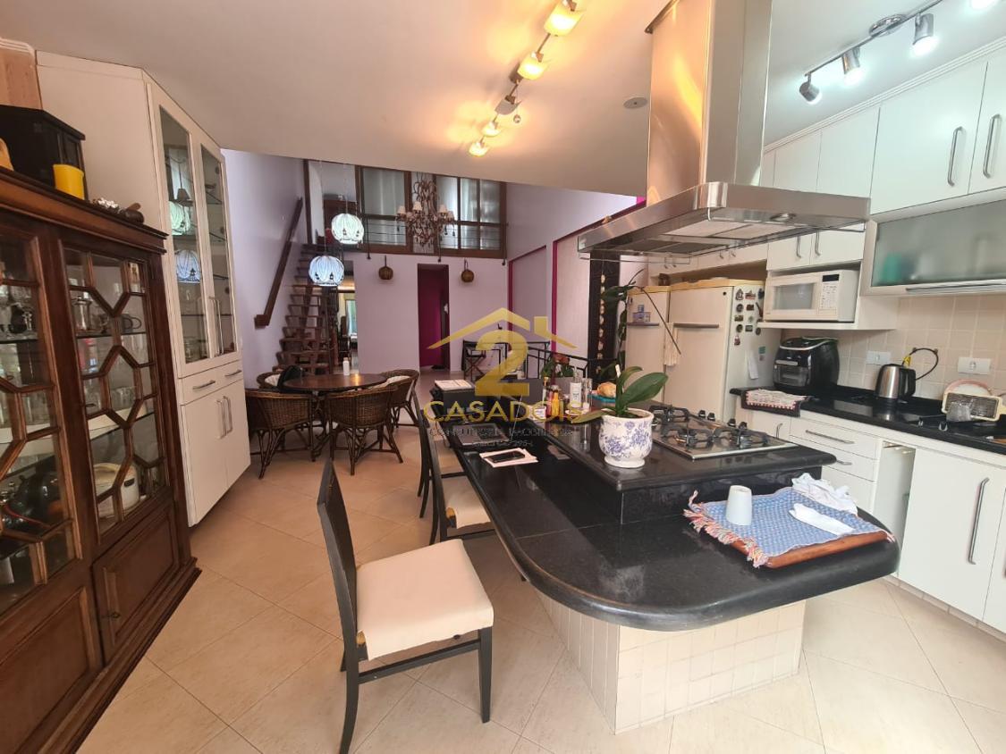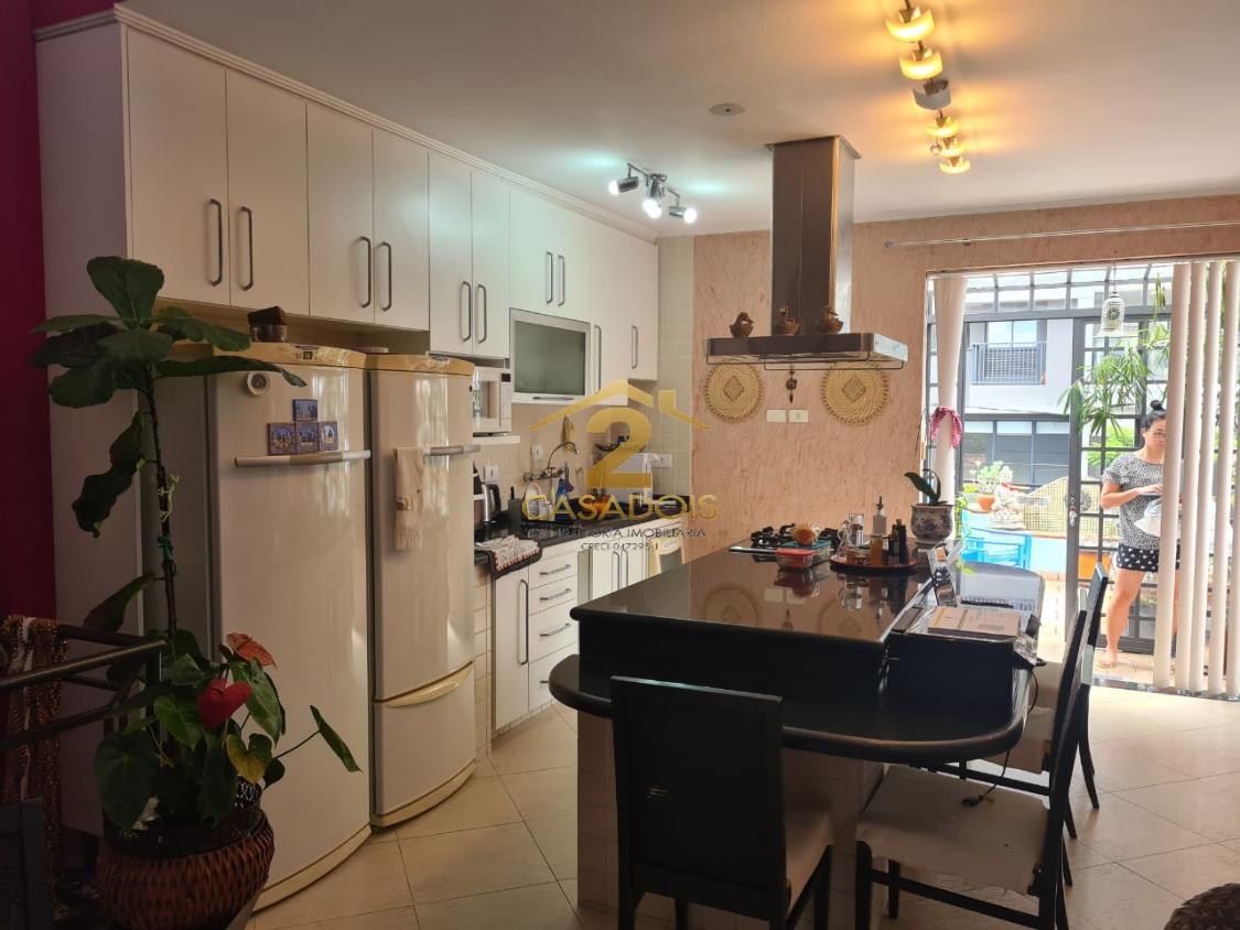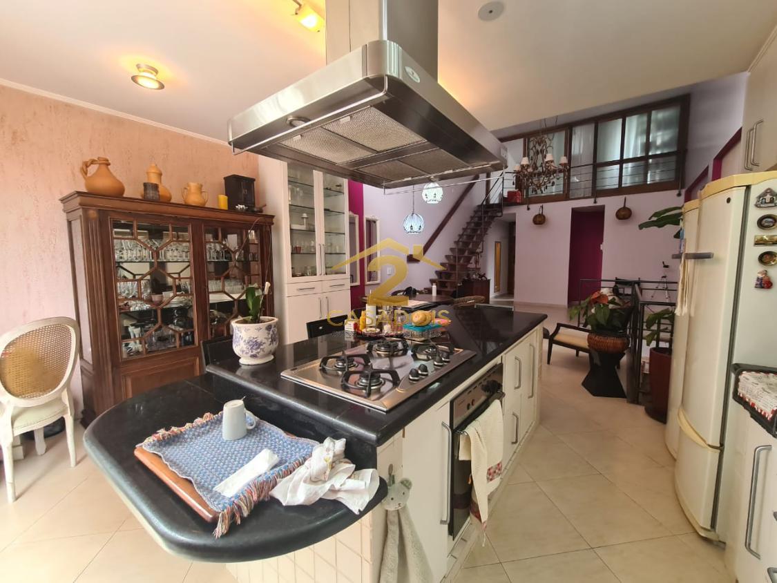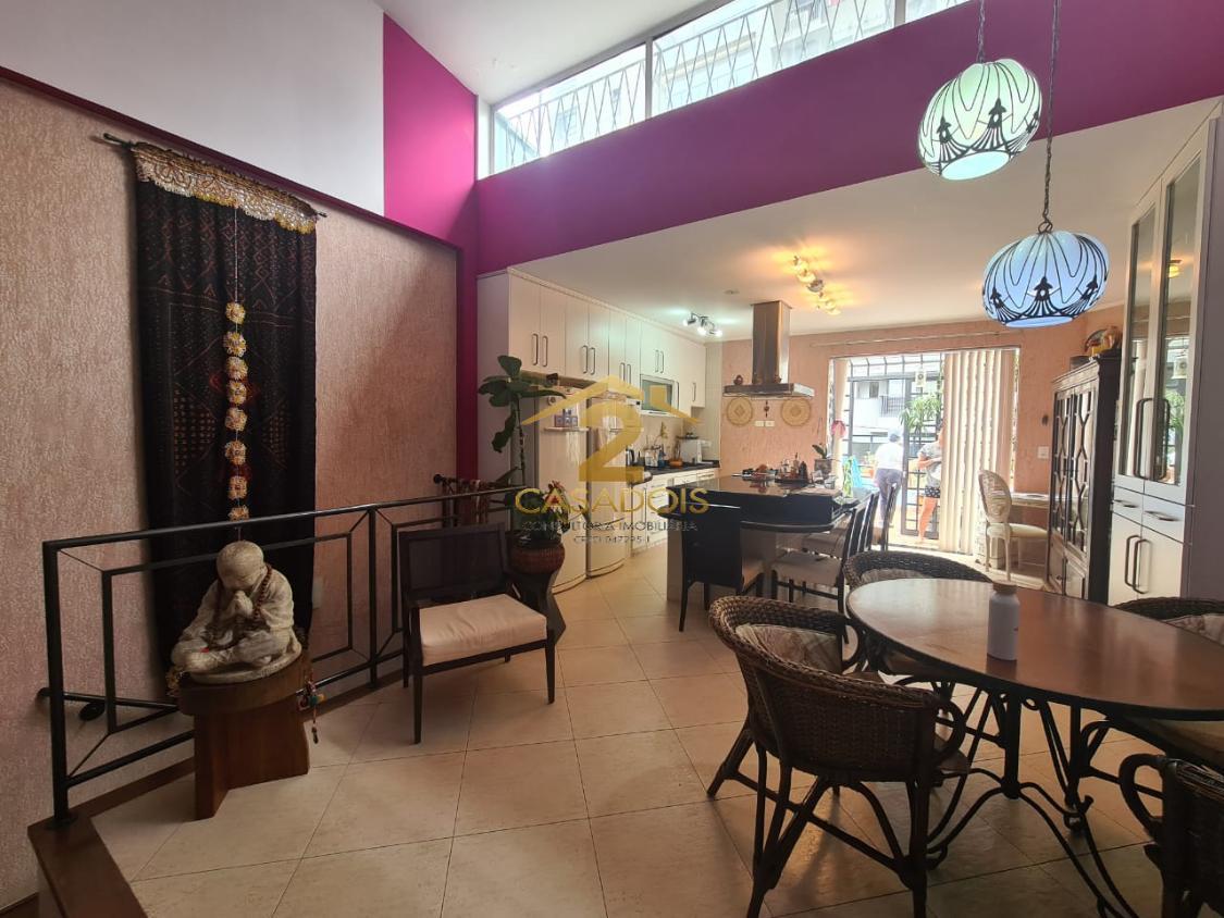 A área social é ampla e bem distribuída, com piso em porcelanato e espaço para salas de jantar, estar e convivência. Há ainda lavabo e uma cozinha planejada, generosa, com ilha central em granito e cooktop, perfeita para quem gosta de receber.